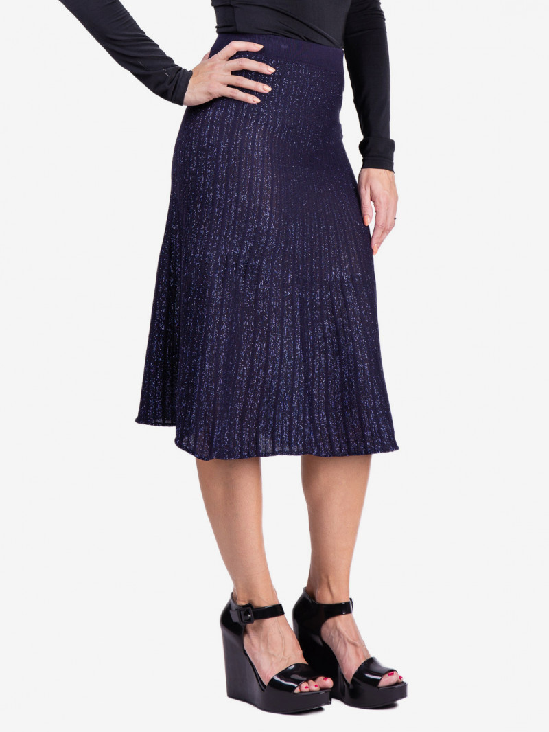 Anany sukně s třpytivými pruhy je oslňující. Je pružná, střih je upnutý, ve spodní části se ale rozšiřuje.