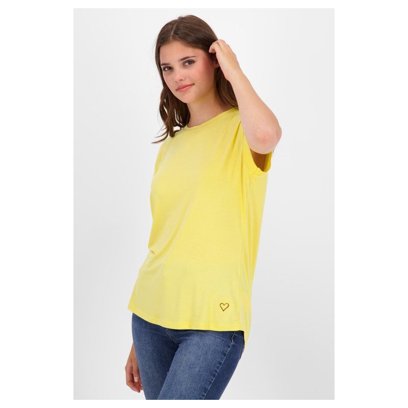 Alife and Kickin MimmyAK A Lime je jednoduché a pohodlné dámské tričko v svítivě žluté barvě. Má klasický střih s prodlouženou délkou, kulatý výstřih a krátké rukávy. Zdobí ho roztomilé logo ve tvaru srdce na boku a kruhové logo na zádech. Perfektně se kombinuje, hodí se k sukni i ke kalhotám. Je vyrobené z příjemné splývavé viskózy s příměsí elastanu a stane se určitě nepostradatelným základním prvkem vašeho letního šatníku.