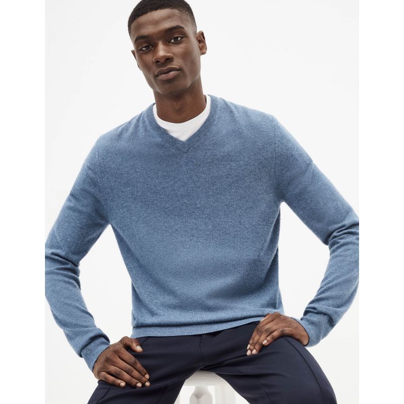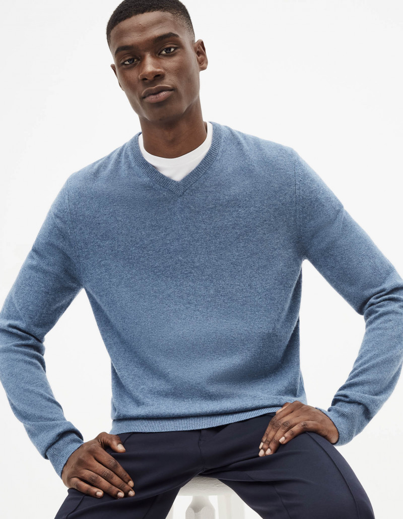 Pletený svetr s výstřihem V. Světle modrý melír. Příjemný materiál s příměsí vlny. Materiál: 45% Polyamid, 45% Viskóza, 10% Vlna