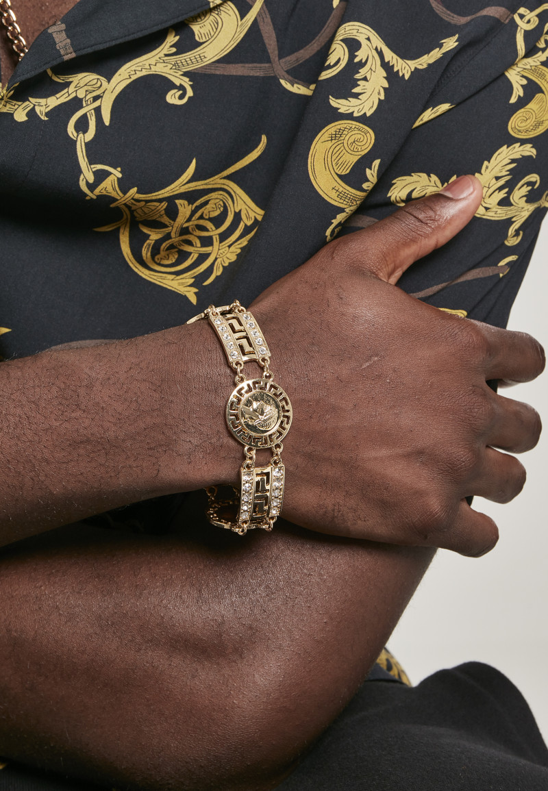 Začněte žít jako aristokraté starověkého Řecka, včetně těch nejdivočejších večírků a nejlepších vín. Jediné, co musíte udělat, je dopřát si tento náramně zpracovaný náramek ve zlatém stylu. Jednotlivé prvky, vyrobené ze zlatých vzorů a řemeslných kamenů, jsou spojeny jemnými řetízkovými prvky. Mezi tím září triumfální zlaté tváře jasně jako slunce. velikost: S/M=19-20cm L/XL=22-22,5cm