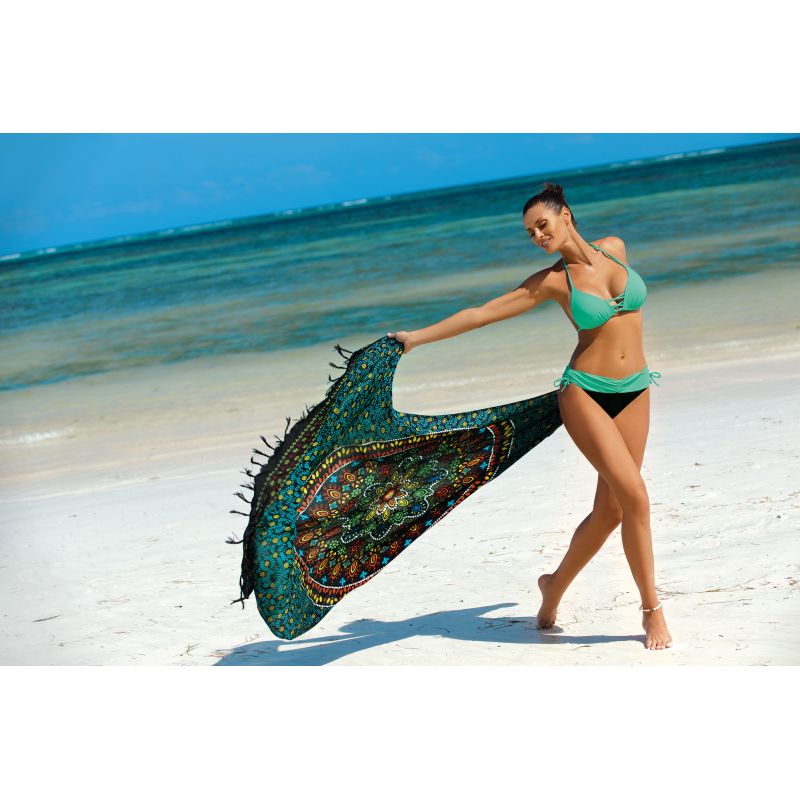 Podprsenka s košíčky vyztuženými jemnou pěnou, s push-upem trvale umístěným v modelu (bez možnosti jeho sundání), hezky sbírá prsa, přibližuje je a opticky zvětšuje, čímž vytváří hluboký, smyslný dekolt najednou .Pruhy uprostřed umocňují tento sexy dojem. Kliky jsou k dispozici v každé velikosti modelu. Podprsenka se zavazuje jak kolem krku, tak na zádech. Sada obsahuje kalhotky s ozdobnými zavazováním po stranách, vložené tradičně (vázání je ozdobným prvkem). Elegantní barvy, které dokonale zapadají do letní atmosféry. Složení: 80% polyamid, 20% elastan.
