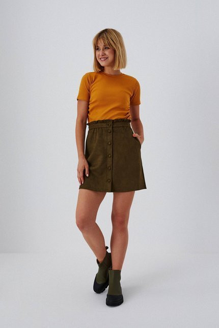 100% POLYESTER Krátká olivová sukně s trapézovým střihem. Hladké, bez vzoru. Ozdobné knoflíky uprostřed předního dílu, dvě kapsy schované v bočních švech. Dva záhyby vzadu přizpůsobí sukni postavě. Bez zipu, elastický pas a volán. Vyrobeno z materiálu imitujícího semiš. Délka do půli stehen. Módní kousek do šatníku pro nadcházející podzim nebo zimu.
