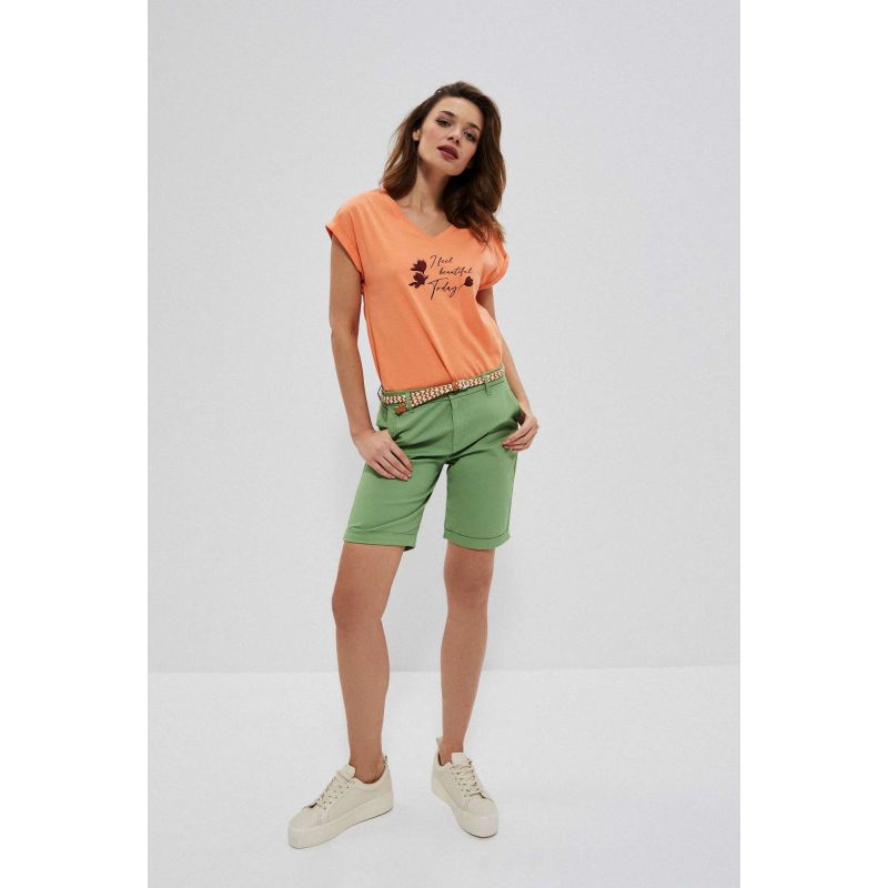 98% BAVLNA, 2% ELASTAN Zelené, dámské šortky s pravidelným pasem. Klasické zapínání na zip a knoflík. Skluzové kapsy na přední a zadní straně. Poutka na pásek v pase. Včetně ozdobného pleteného opasku. Rovné nohavice s ohrnutým lemem. Délka nad kolena. Pohodlný a praktický střih. V kombinaci s barevným tričkem vytvoří kraťasy veselý letní look.