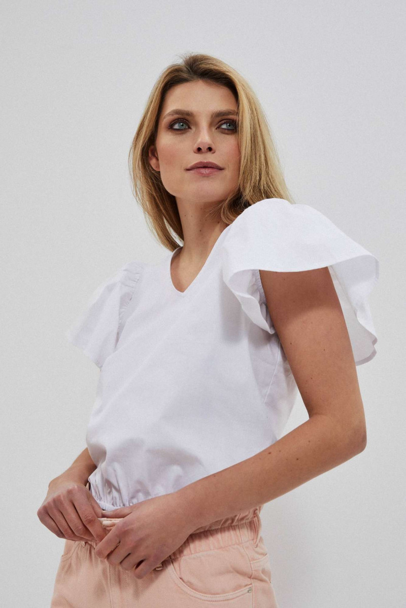 100% BAVLNA Bavlněná halenka volného střihu. Bílé, hladké, bez vzoru. Krátké motýlkové rukávy, silně nabírané na ramenou. Výstřih do V lemovaný úzkou lemovkou. Zapínání na knoflíky na zádech. Spodní část halenky je nařasená gumičkou. Vypadá pěkně zastrčený uvnitř kalhot nebo vytažený.
