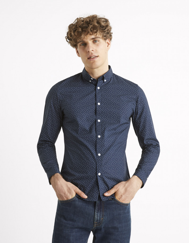 - Menší límec se zapínáním na knoflík a zaobleným spodním lemem