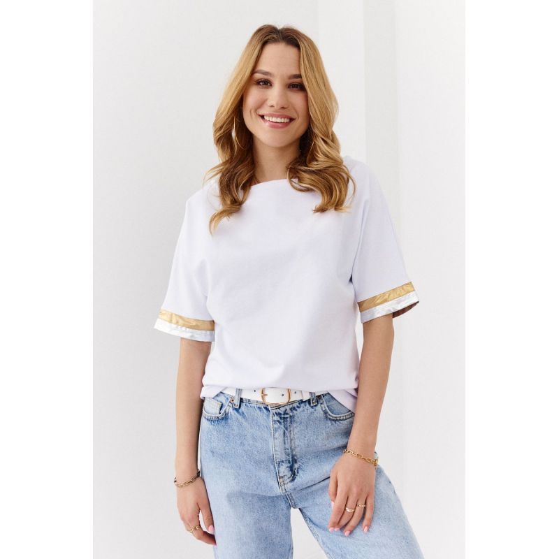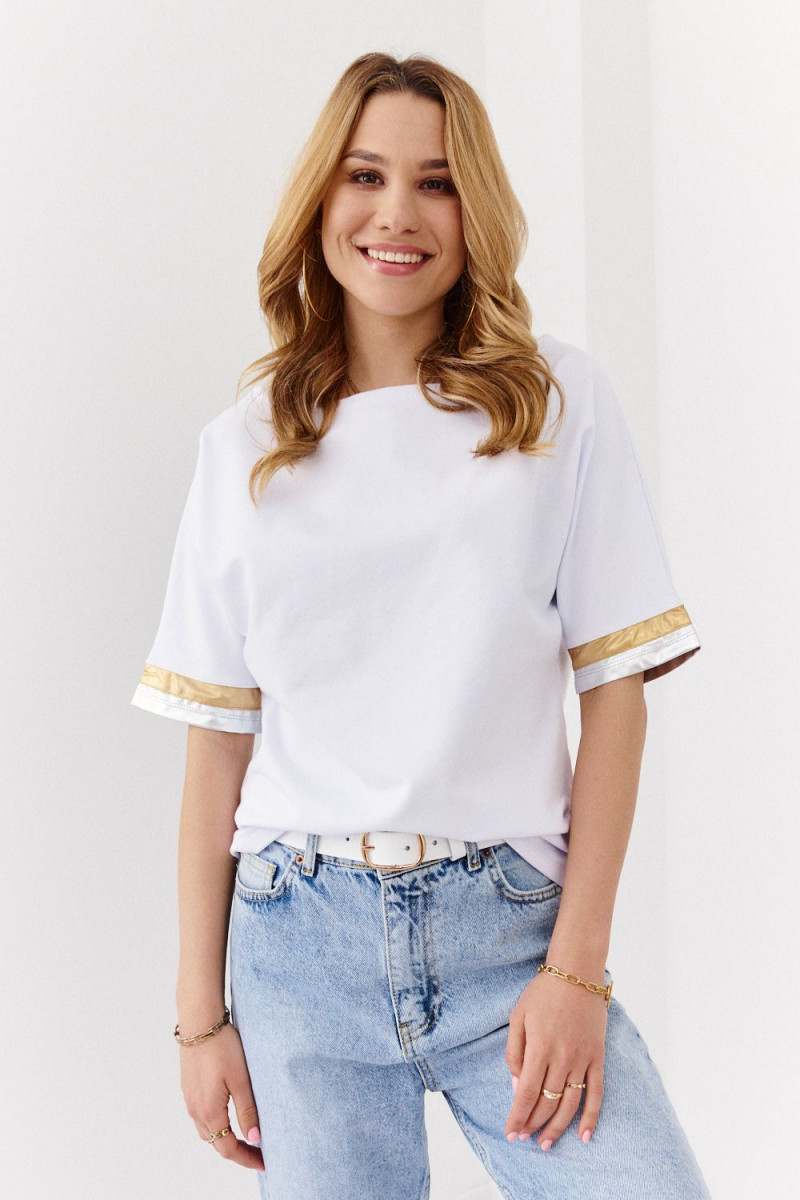 Ležérní střih, příjemný materiál a všestrannost tohoto modelu z něj udělají častého hosta ve vašich každodenních stylizacích. volný střih lodičkový výstřih krátký rukáv zakončený zlatou a stříbrnou vsadkou pružný materiál
