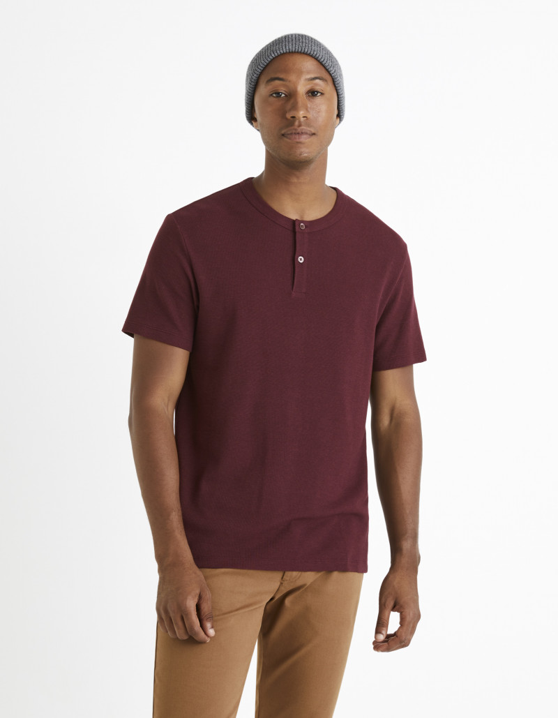 Příjemné jednobarevné tričko s krátkým rukávem. Kulatý výstřih se zapínáním na tři knoflíčky. Rovný střih. Hodí se k džínům a teniskám.
