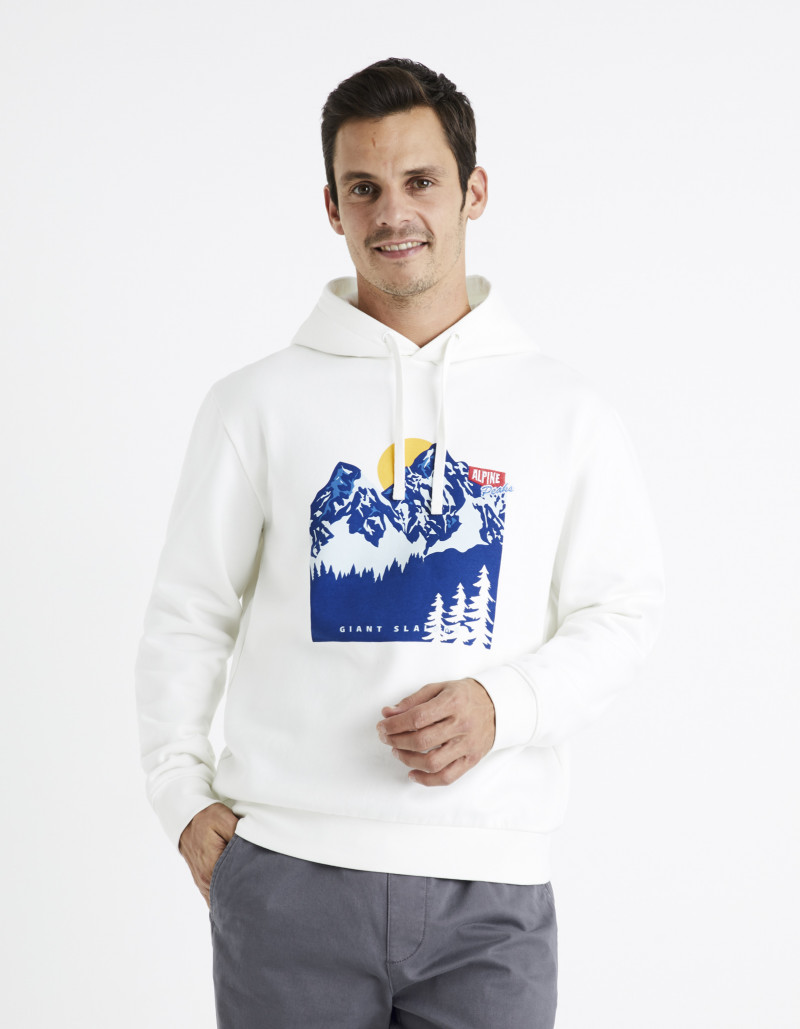 Mikina v bílé barvě s výrazným potiskem na přední straně. Drobná výšivka, kapuce se stahovací šňůrkou a dlouhé rukávy s náplety.