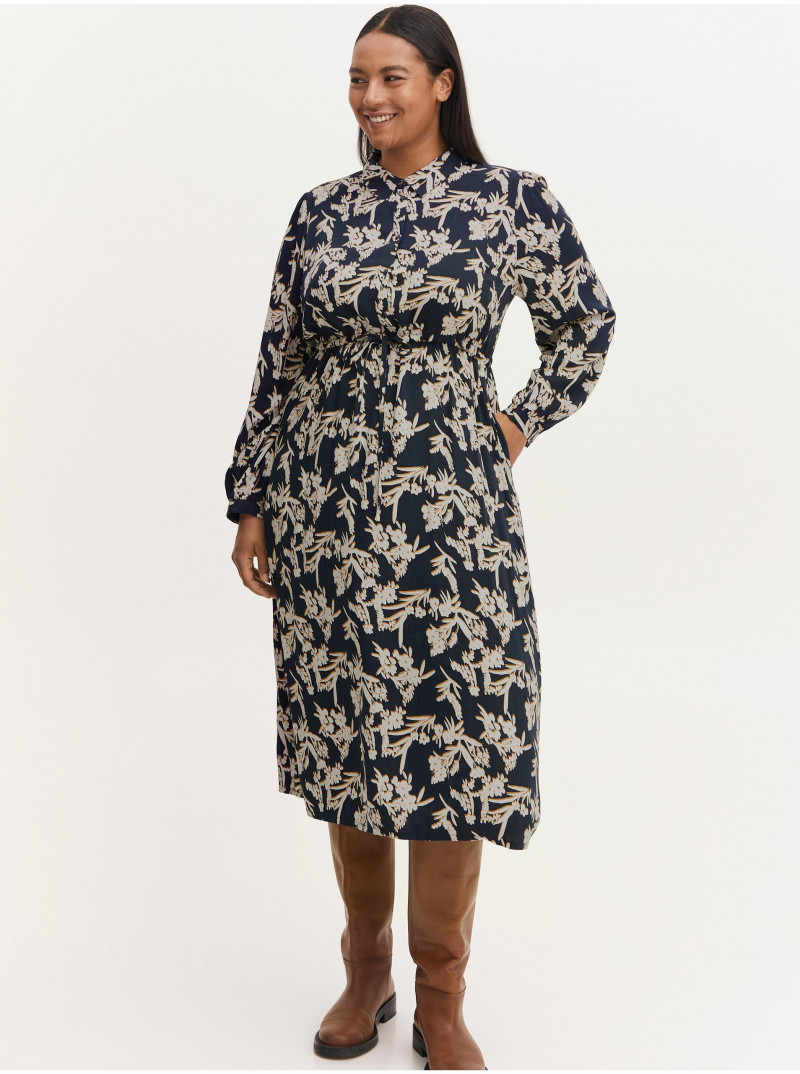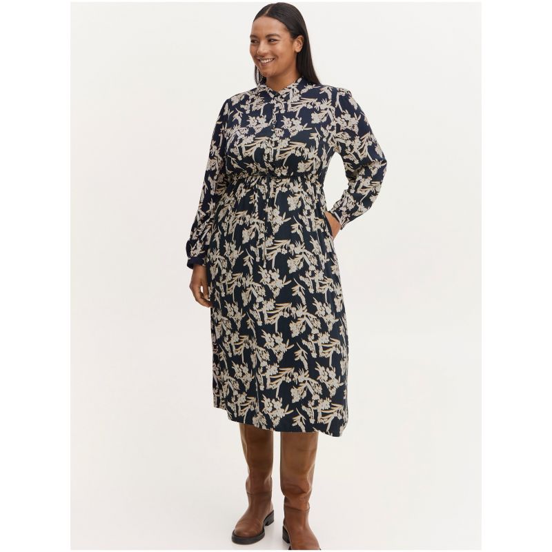 Barva: tmavě modrá, krémová Vzor: květovaný Střih: košilový, áčkový Délka: ke kolenům Výstřih: s límečkem Rukáv: dlouhý Zapínání: knoflíky Něco navíc: pásek Materiál: 100 % viskóza Modelka měří: 180 cm Modelka má na sobě velikost: 46