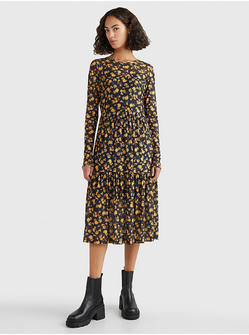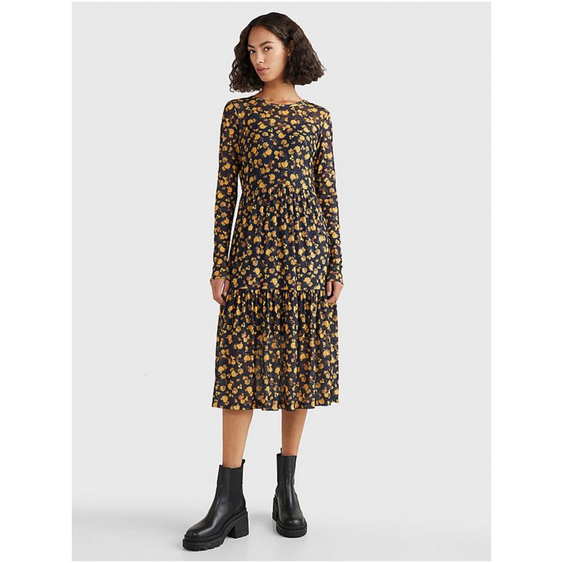 Žluto-černé dámské květované midišaty Tommy Hilfiger Mesh Rose - Dámské