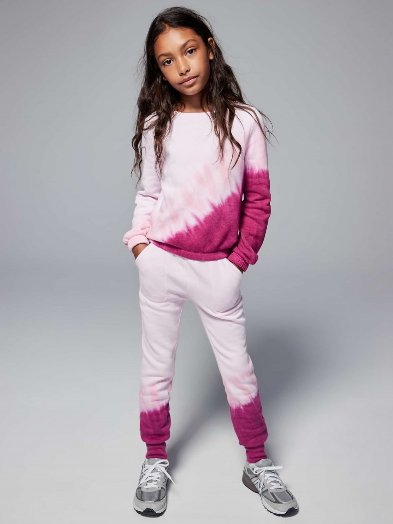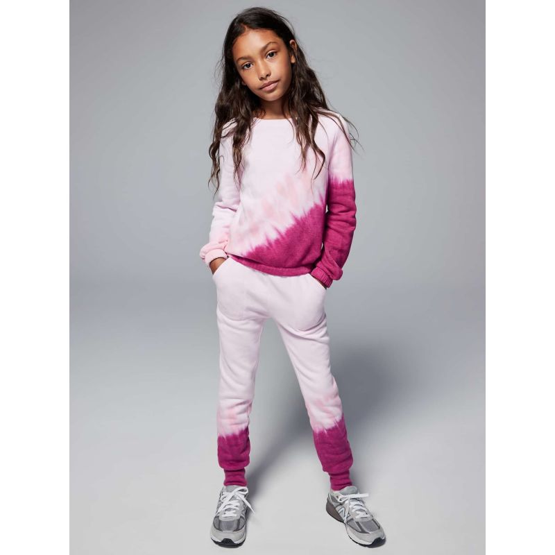 Dívčí mikina s výraznou růžovou batikou. Střih přes hlavu. Dlouhé rukávy s náplety. Kulatý výstřih ke krku.