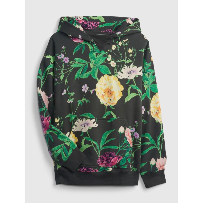 Dětská mikina s kapucí. Výrazný květinový vzor. Delší střih. Klokaní kapsa. 23% recyklovaný polyetser.