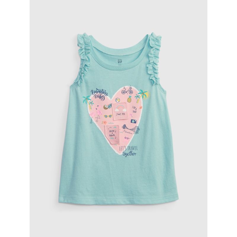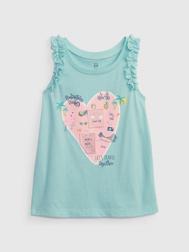 Dětské tílko v zelené barvě. Na přední straně růžové srdce. Hlubší kulatý výstřih. Průramky ozdobené volánky. Áčkový střih. Měkký bavlněný úplet.