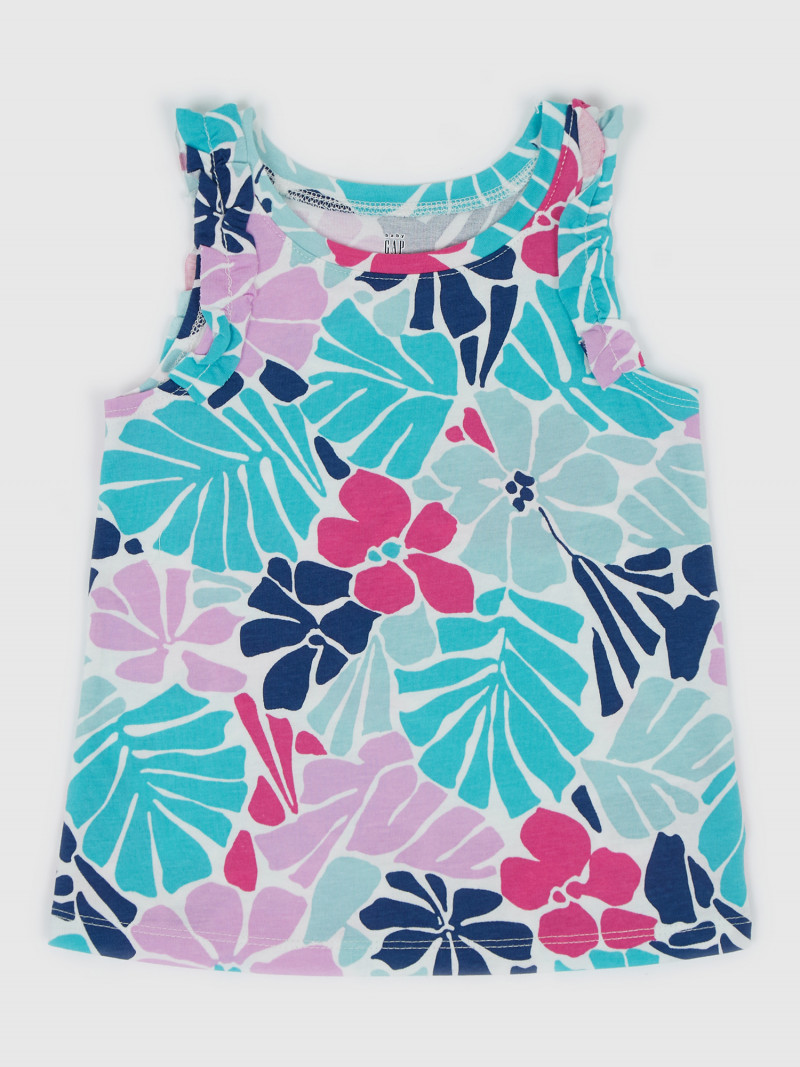 Dětské tílko s volánky u rukávů. Moderní tropický vzor. Kulatý výstřih. 100% bavlna.