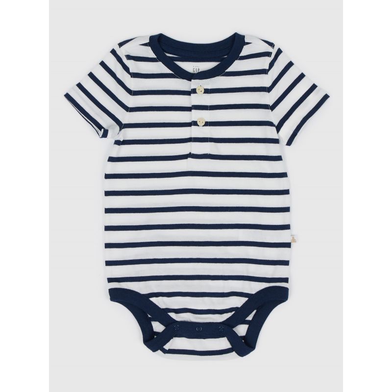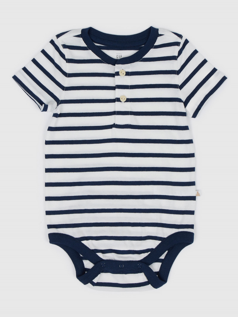 Dětské pruhované body. Kulatý výstřih se zapínání na 2 knoflíčky. Krátký rukávek. V nohavičkách zapínání na patentky. 100% bavlna.