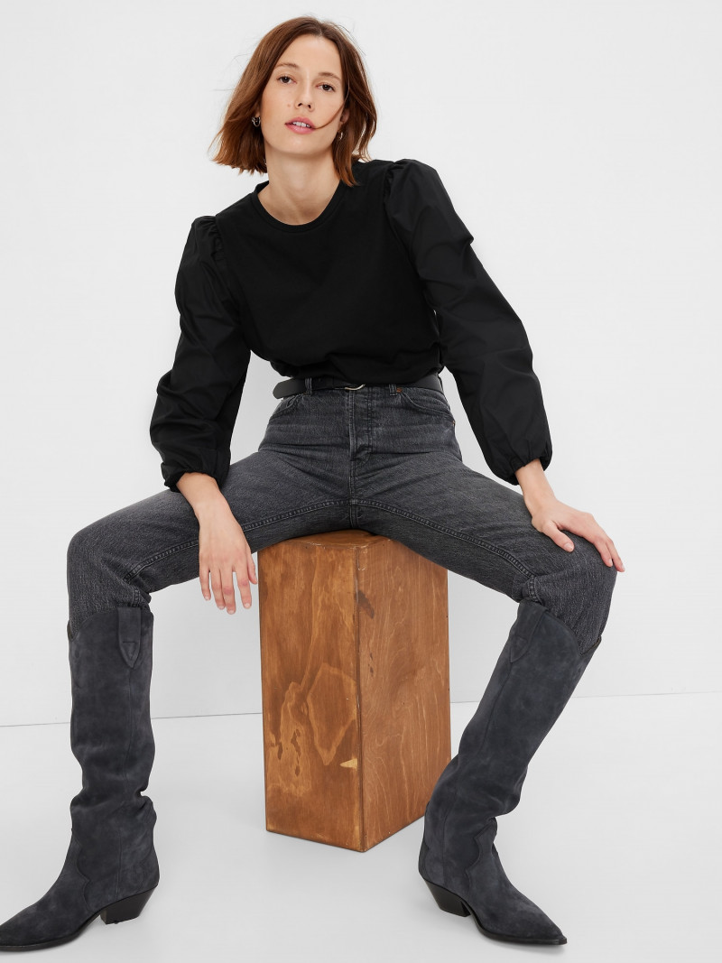 Dámská jednobarevná halenka. Měkký bavlněný úplet. Kulatý výstřih ke krku. Bohatě nabírané dlouhé rukávy. Rovný střih.
