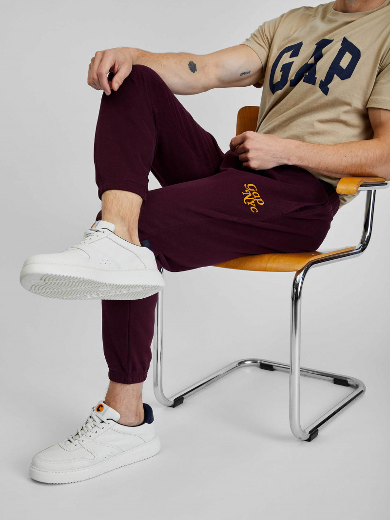 Pánské jednobarevné tepláky. Drobné logo Gap. Pružný pas a šikmé boční kapsy. Dlouhé nohavice s pružným lemem.