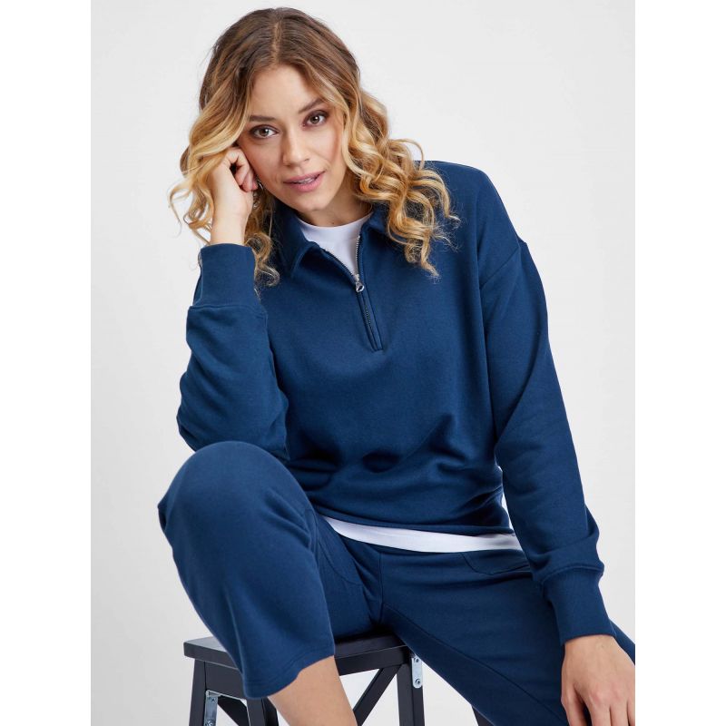 Dámská jednobarevná mikina. Střih přes hlavu. U krku límeček se zapínáním na zip. Dlouhé spadlé rukávy s náplety. Příjemný materiál.