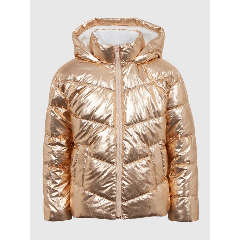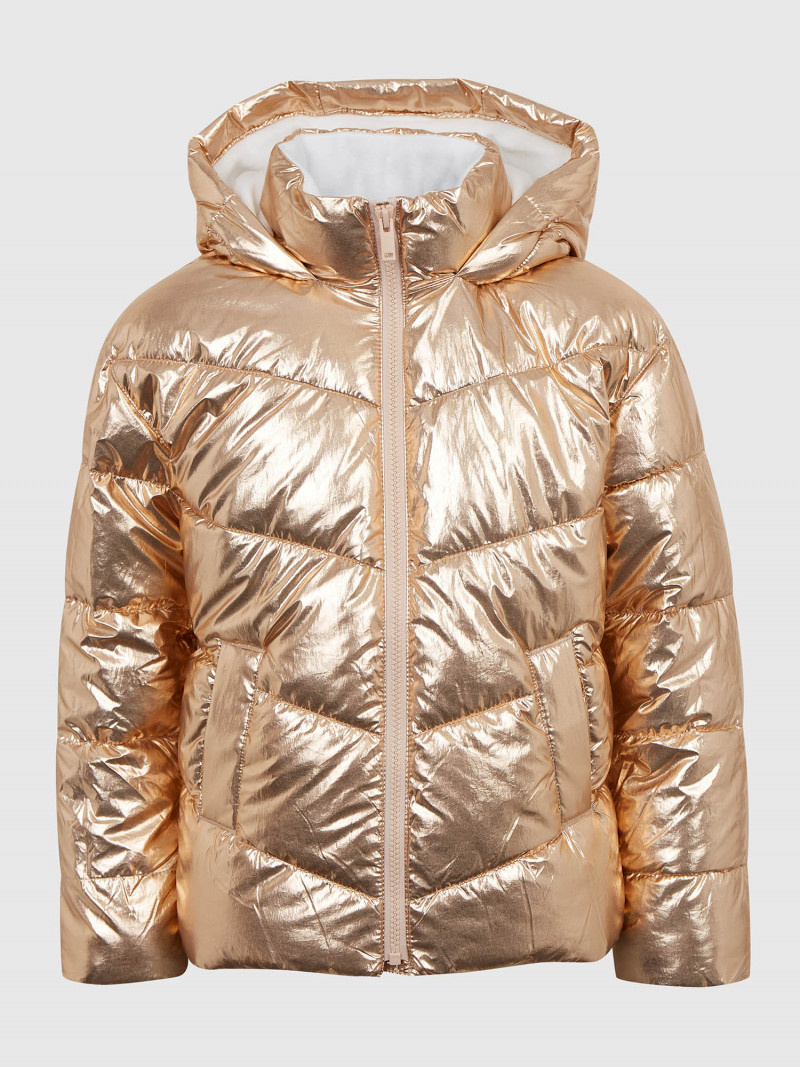 Dívčí zimní prošívaná bunda. Zlatá metalická barva. Se zapínáním na zip. U krku vysoký stojáček a kapuce. Přední šikmé kapsy. Zateplena fleece v bílé barvě.
