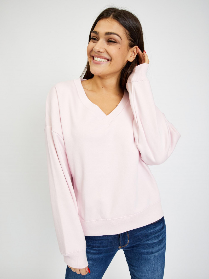 Dámská jednobarevná mikina. Drobné vyšité logo GAP. Výstřih do V. Dlouhé spadlé rukávy s náplety. Volnější střih. Příjemný materiál.