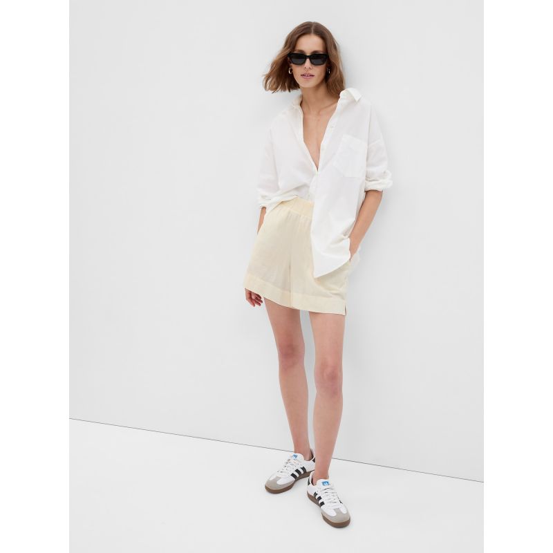 Dámské kraťasy s příměsí lnu. Pružný vysoký pas. Přední šikmé kapsy. Volné nohavice s rozparky. Jednobarevné.