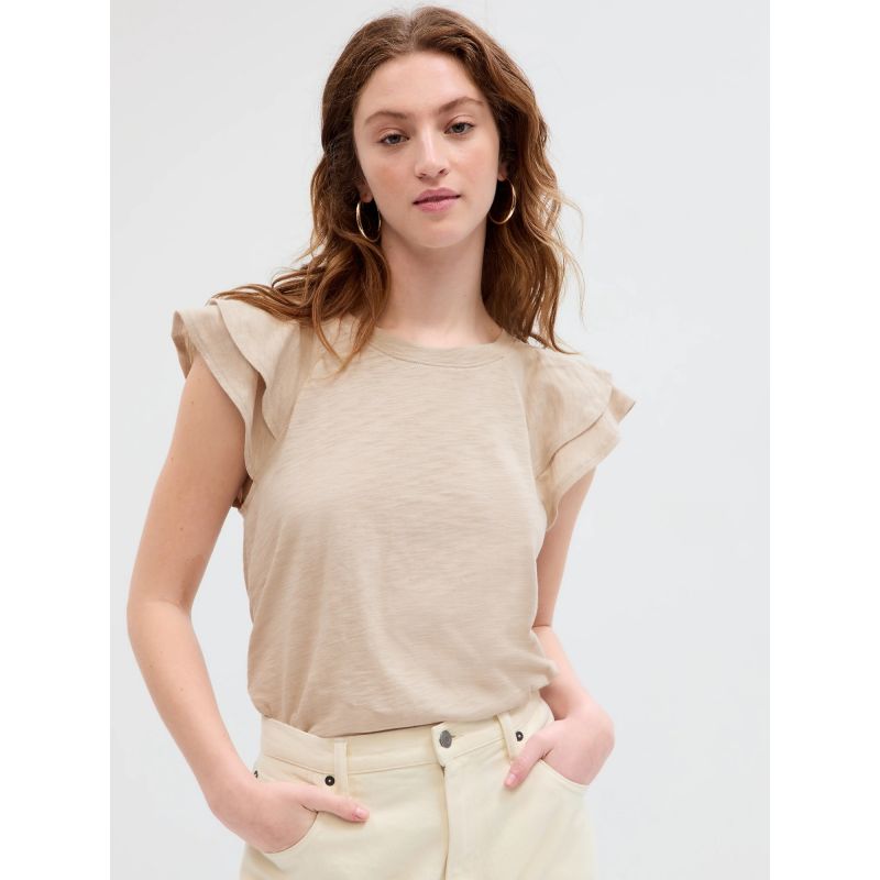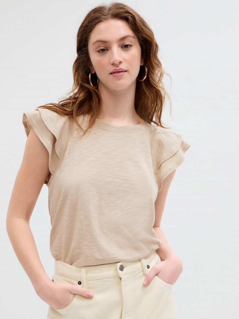 Dámské tričko. Volánkové krátké rukávy. Kulatý výstřih ke krku. Rovný střih. Jednobarevné.