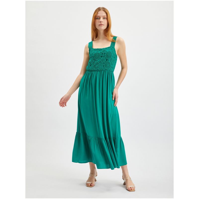Barva: zelenáStřih: áčkovýDélka: dlouháVýstřih: hranatýRukáv: bez rukávůZapínání: bez zapínáníNěco navíc: volánMateriál: vnější část - 100 % viskózapodšívka - 100 % viskózakrajka - 85 % bavlna, 15 % polyamid / nylonModelka měří: 176 cmModelka má na sobě velikost: S