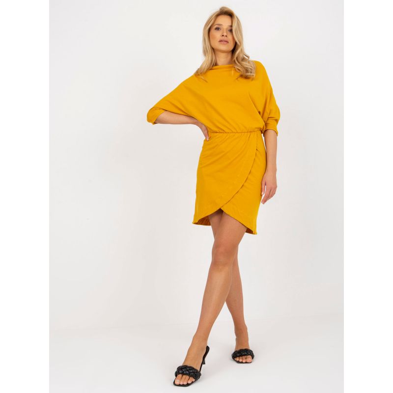 Tmavě žluté šaty pro každodenní nošení s řasením a 3/4 rukávy .