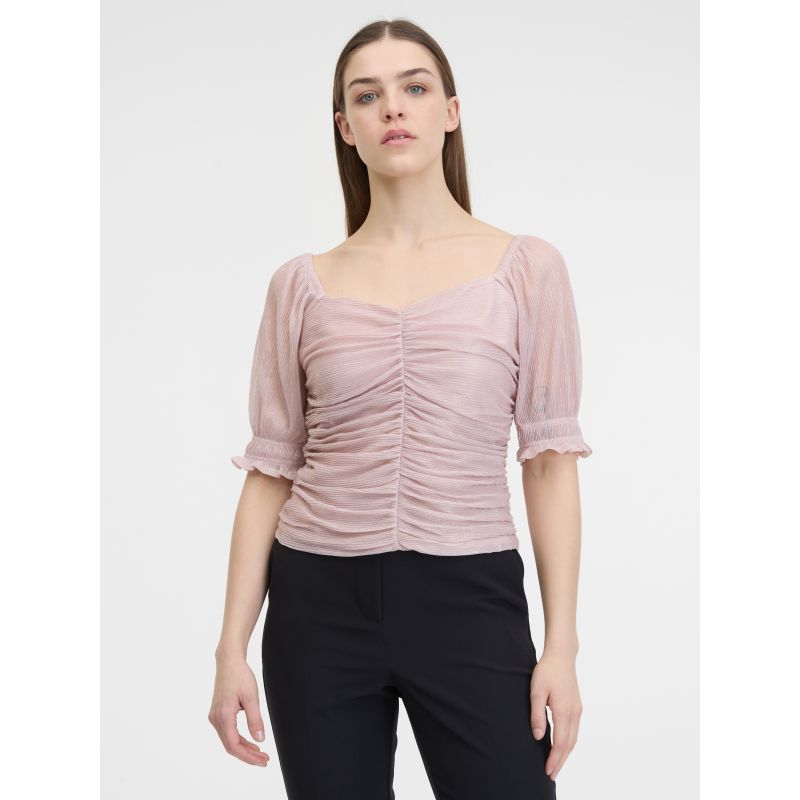 Barva: světle růžováStřih: slim fitVýstřih: hranatýRukáv: krátkýZapínání: bez zapínáníNěco navíc: volán, nařaseníMateriál: hlavní část - 79 % polyester, 21 % kovová vláknapodšívka - 100 % polyesterModelka měří: 176 cmModelka má na sobě velikost: S
