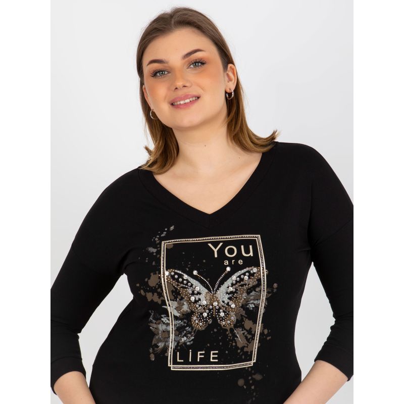 Modelka má na sobě jednu velikost. Míry modelky: výška 176 cm, prsa 111 cm, pas 82 cm, boky 114 cm. Rozměry halenky jedné velikosti měřeny naplocho: šířka v podpaží - 57 cm, délka rukávu - 40 cm, celková délka - 59 cm.