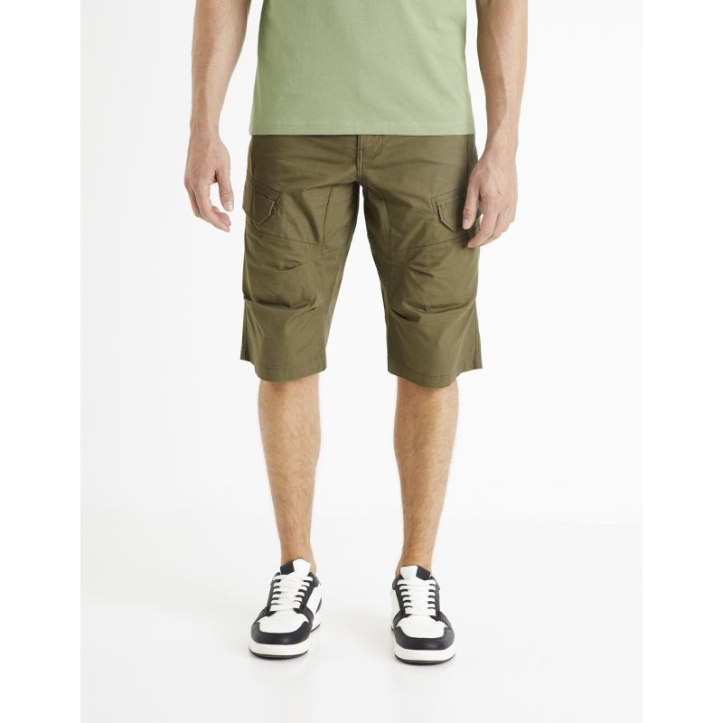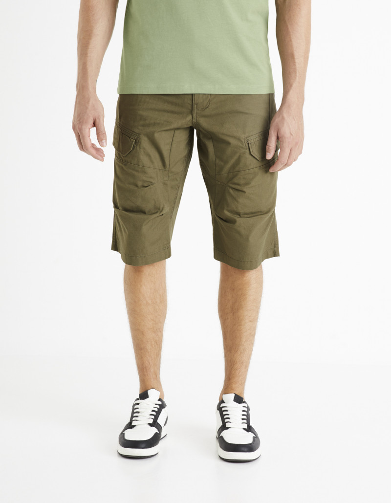 Bavlněné kraťasy s kapsami. Pevný pas s poutky na pásek. Zapínání na knoflík a zip. Přední šikmé kapsy. Zapuštěné kapsy s klopou. Délka ke kolenům.