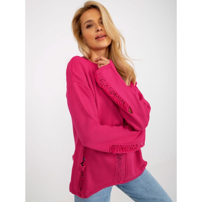 Dámský fuchsiový oversize svetr s dírami a vlnou .