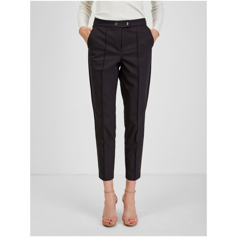 Barva: černá Střih: regular fit Délka: zkrácené Výška pasu: středně vysoký pas Zapínání: patentka, zip Materiál: 54 % bavlna, 43 % polyester, 3 % elastan Modelka měří: 177 cm Modelka má na sobě velikost: S