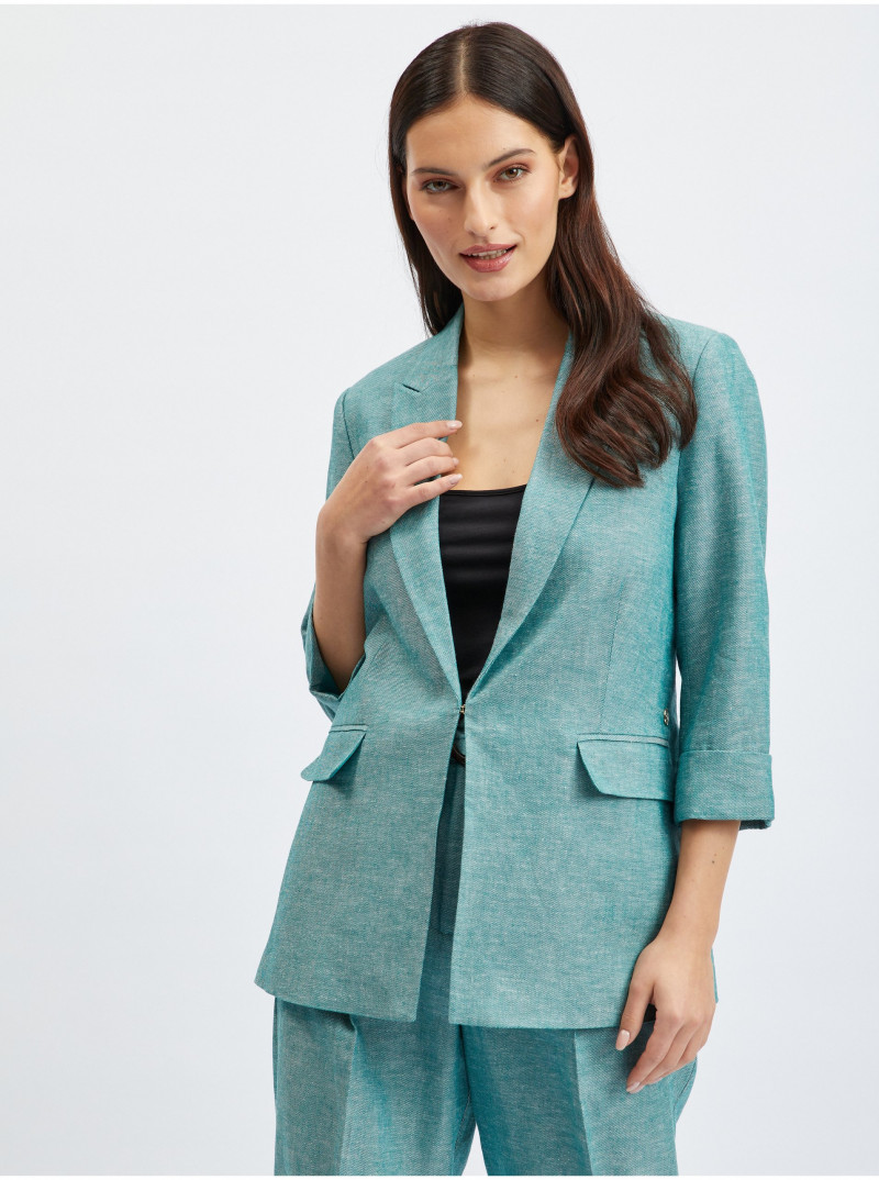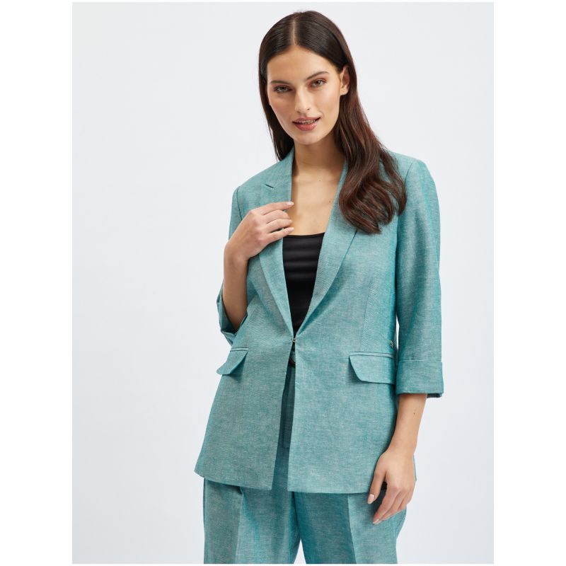 Barva: tyrkysová Střih: regular fit Rukáv: tříčtvrteční Zapínání: patentky Vnější kapsy: 2 Materiál: 52 % len, 48 % viskóza, podšívka - 100 % polyester Modelka měří: 169 cm Modelka má na sobě velikost: S