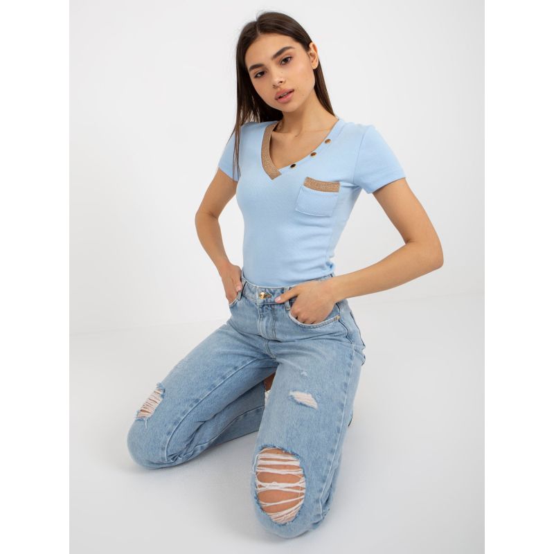 Světle modrá žebrovaná halenka s kapsou .