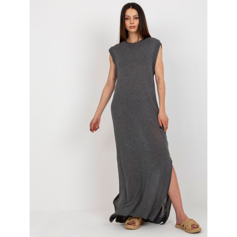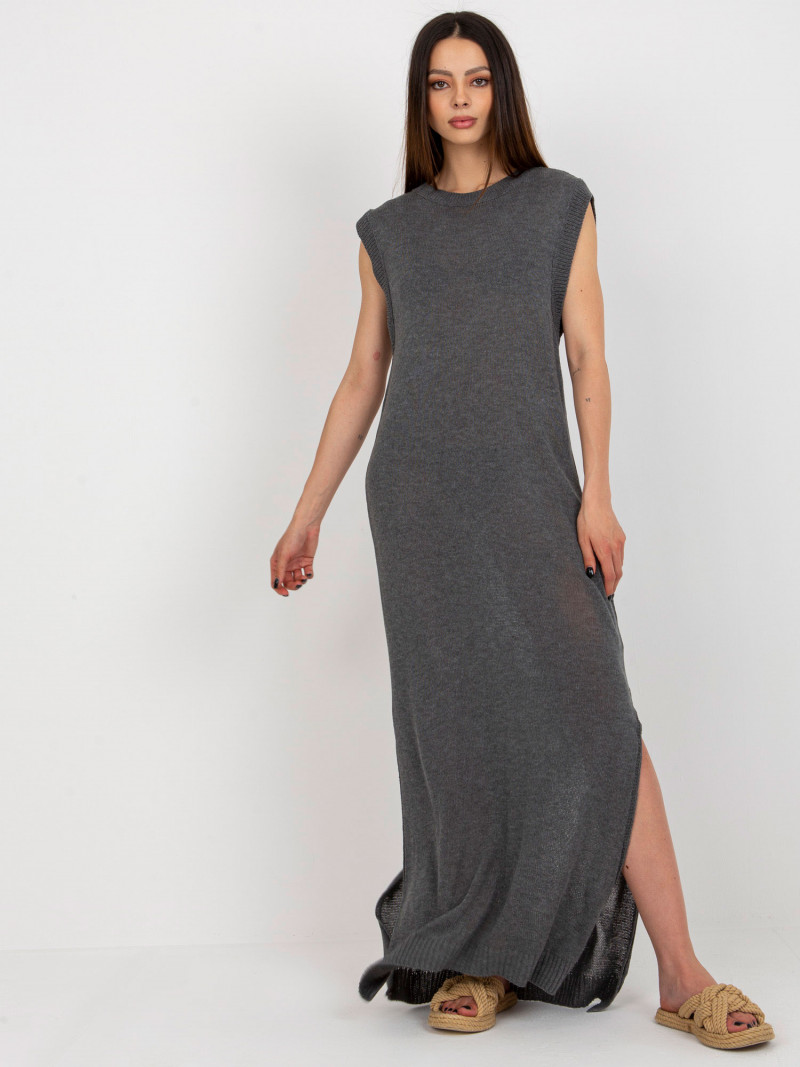 Tmavě šedé úpletové šaty s kulatým výstřihem .