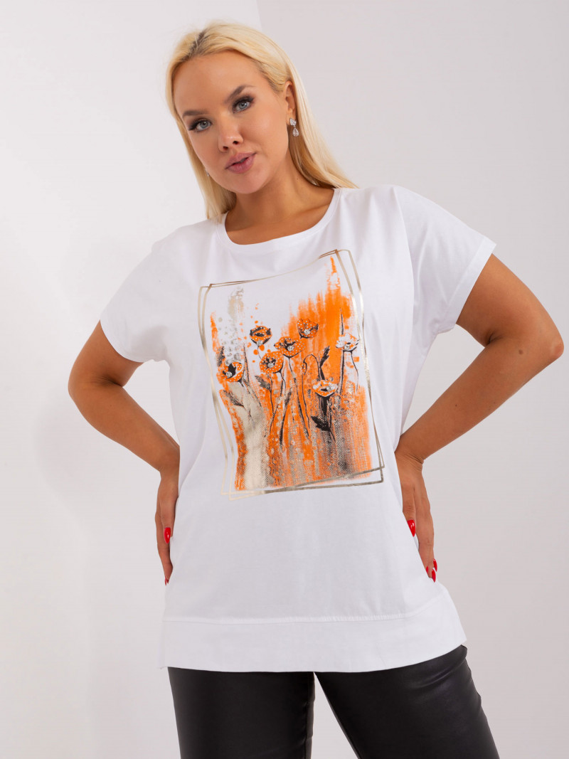 Bílooranžová halenka plus size s kulatým výstřihem .