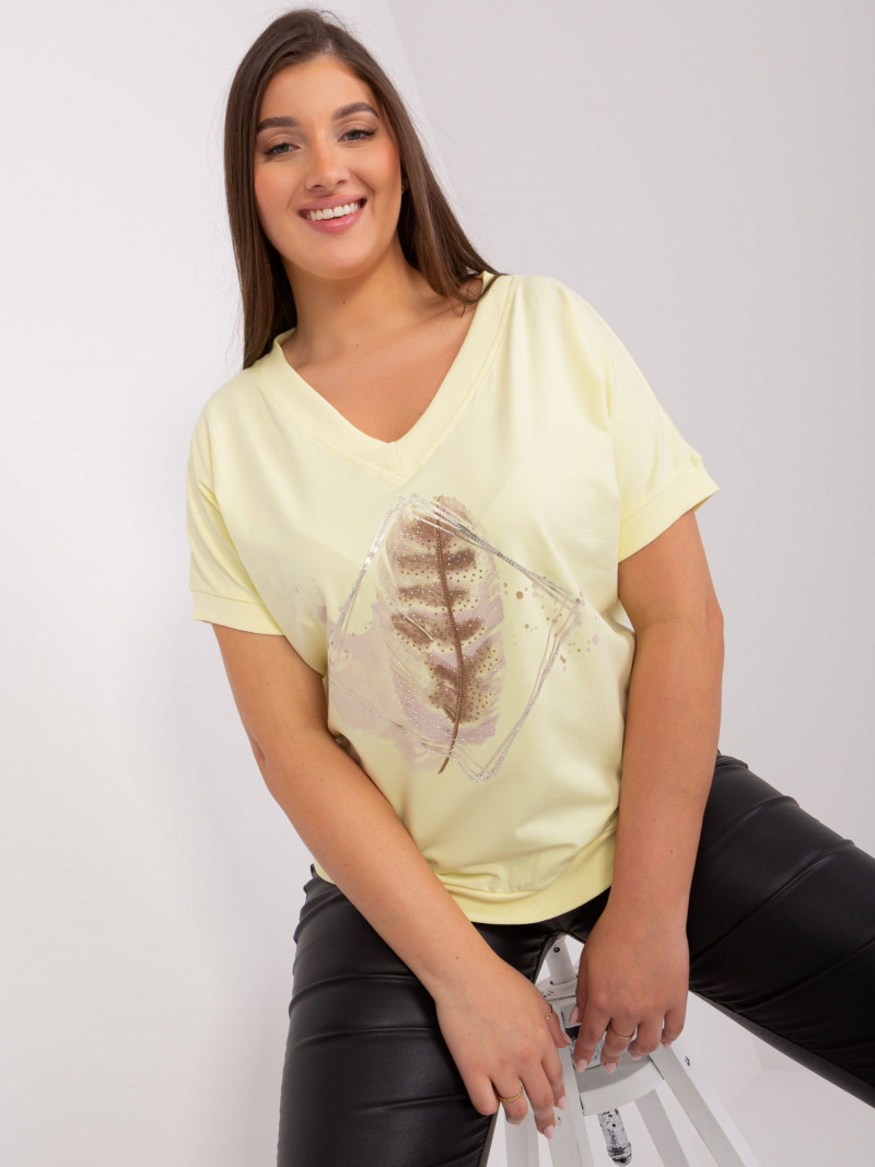 Světle žlutá halenka větší velikosti s potisky .