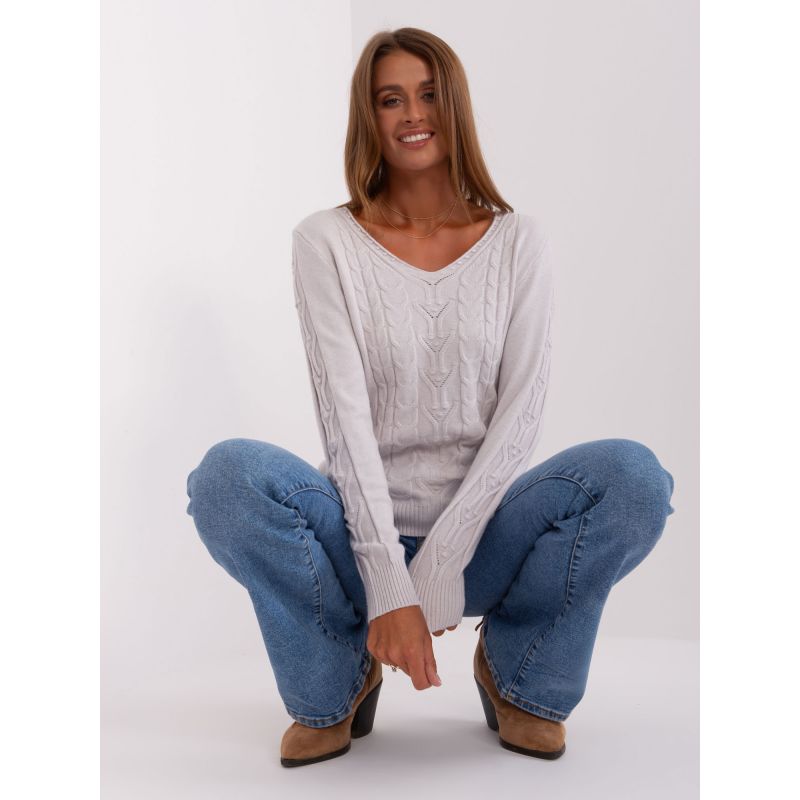 Světle šedý svetr s kabely a dlouhými rukávy .