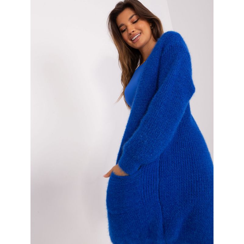 Kobaltově modrý pletený kardigan bez zapínání .