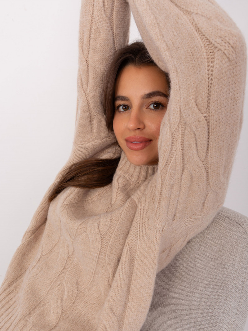 Béžový svetr s copánky a manžetami .