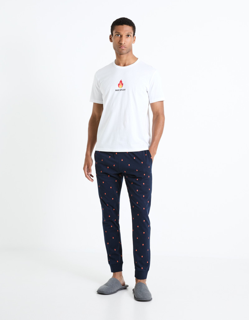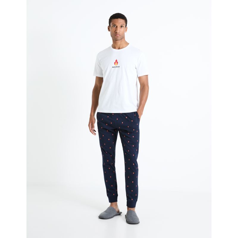 Bavlněné pyžamo s krátkým rukávem. Bílé tričko s drobným potiskem. Dlouhé pyžamové kalhoty se vzorem. Pružný pas se stahovací šňůrkou.