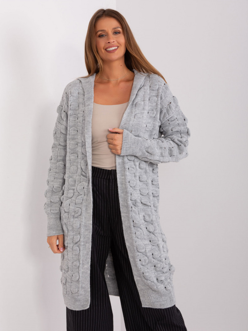 Šedý prolamovaný kardigan s kapucí .