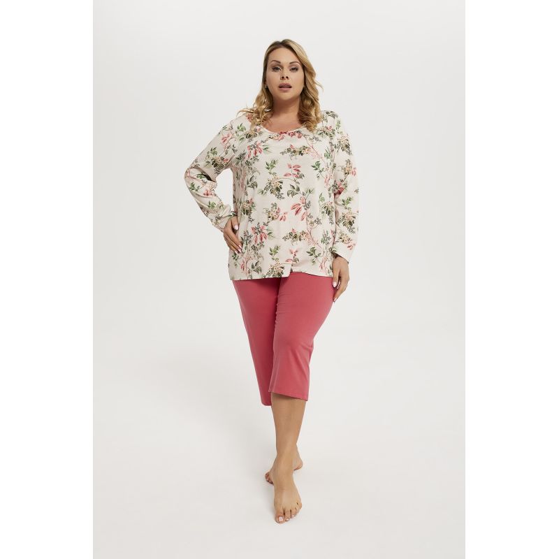 Dámské pyžamo Aksja, dlouhý rukáv, 3/4 nohavice - potisk/malina