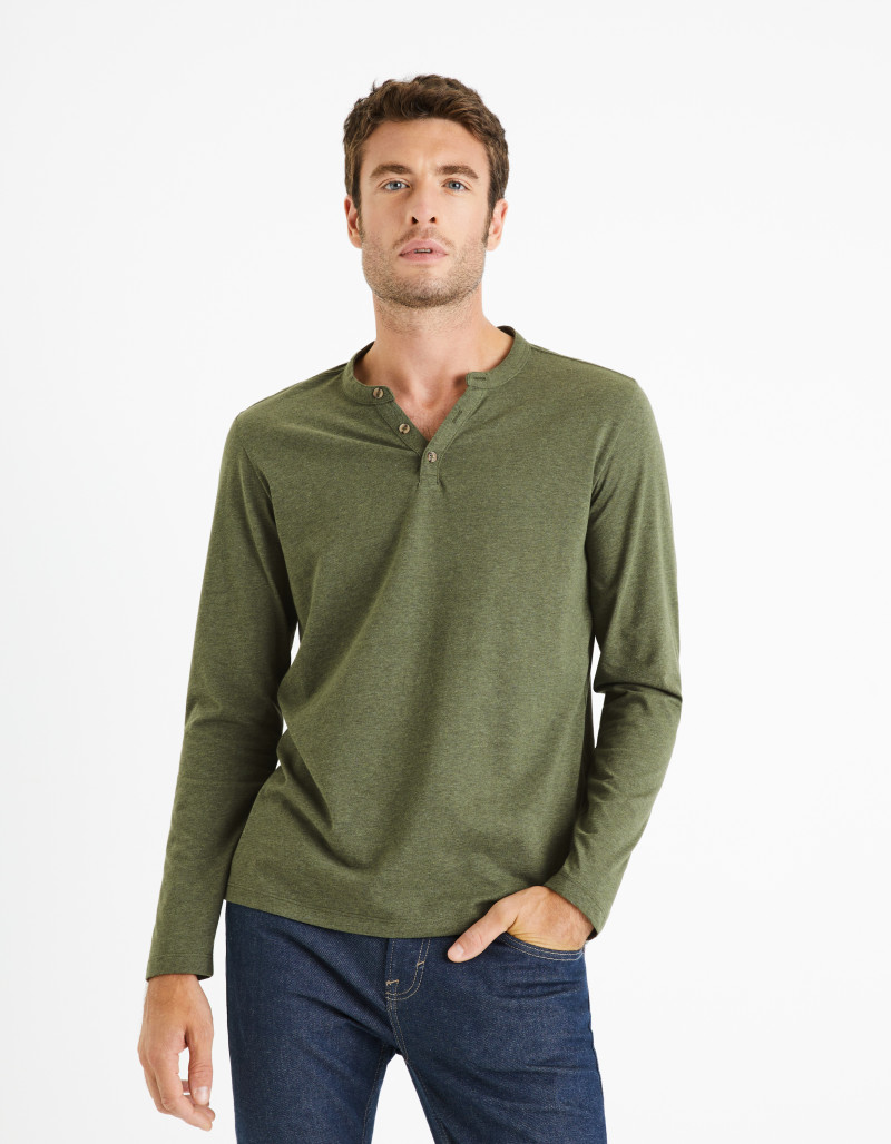 Bavlněné tričko s kulatým výstřihem a knoflíčky u krku. Dlouhé rukávy a rovný střih. Příjemný materiál.