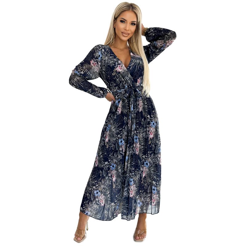Plisované dlouhé šaty s psaníčkovým výstřihem, dlouhými rukávy a páskem na zavazování. Vyrobeno ze šifonového materiálu s podšívkou. Tmavě modrý vzor. Perfektní šaty pro každou příležitost.