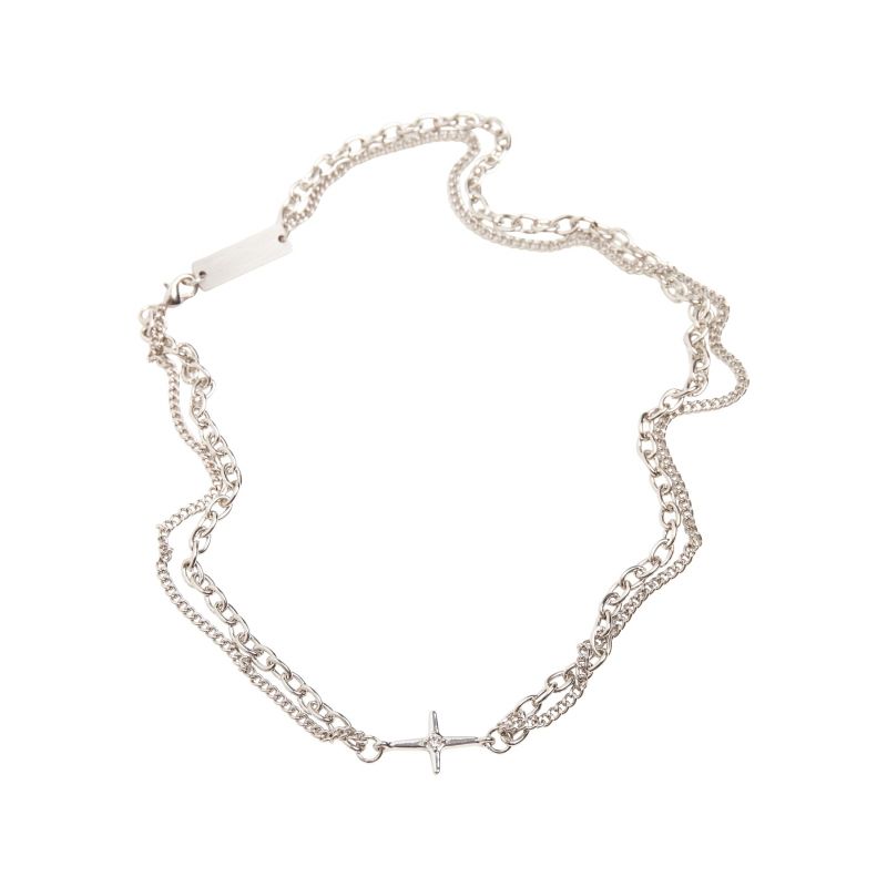Jednoduchý dvouřadý náhrdelník obsahuje dva řetízky dlouhé 53 cm a sedí středně vysoko na krku. Styl sleduje tvary kotevních a obrubníkových řetězů – do designu byla přidána jemná, obdélníková deska s ražbou Urban Classics a malý kříž s kamínky. Šperk je vyroben ze železa a slitiny zinku.