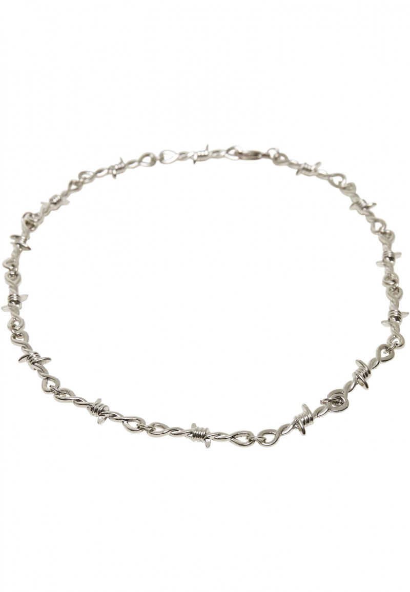 Ti, kteří se cítí pohodlněji se vzdáleností kolem sebe, najdou v tomto originálním náhrdelníku nezbytný doplněk. Jeho tvar jasně připomíná ostnatý drát, přičemž všechny prvky pohodlně leží na kůži. Náhrdelník je vyroben ze slitiny zinku a hodí se zejména k tmavým outfitům.