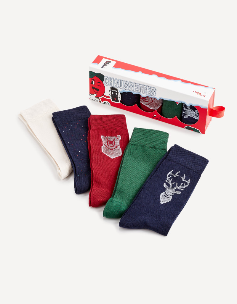 Dárkové balení ponožek. V balení celkem 5 párů. Různé barvy a vzory. Měkké vysoké ponožky s pružným žebrovaným lemem. Papírová krabička s vánočním motivem a praktickým poutkem.Spodní prádlo nelze z hygienických důvodů vracet.