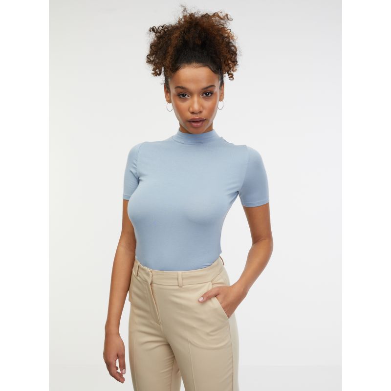 Barva: světle modráStřih: slim fitVýstřih: se stojáčkemRukáv: krátkýZapínání: bez zapínáníKapsy: bez kapesMateriál: 97 % viskóza, 3 % elastanTyp materiálu: viskózaModelka má na sobě velikost: S